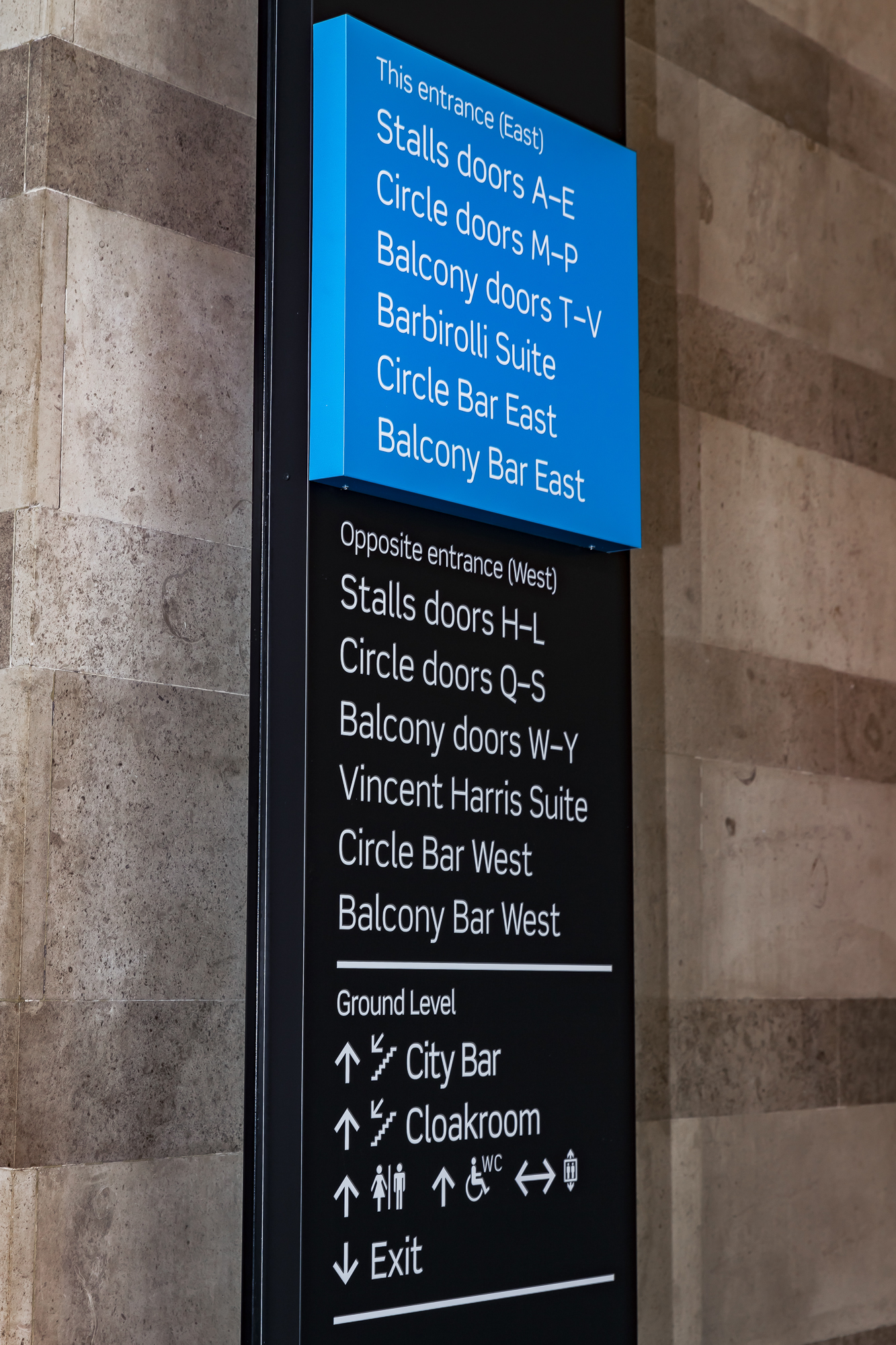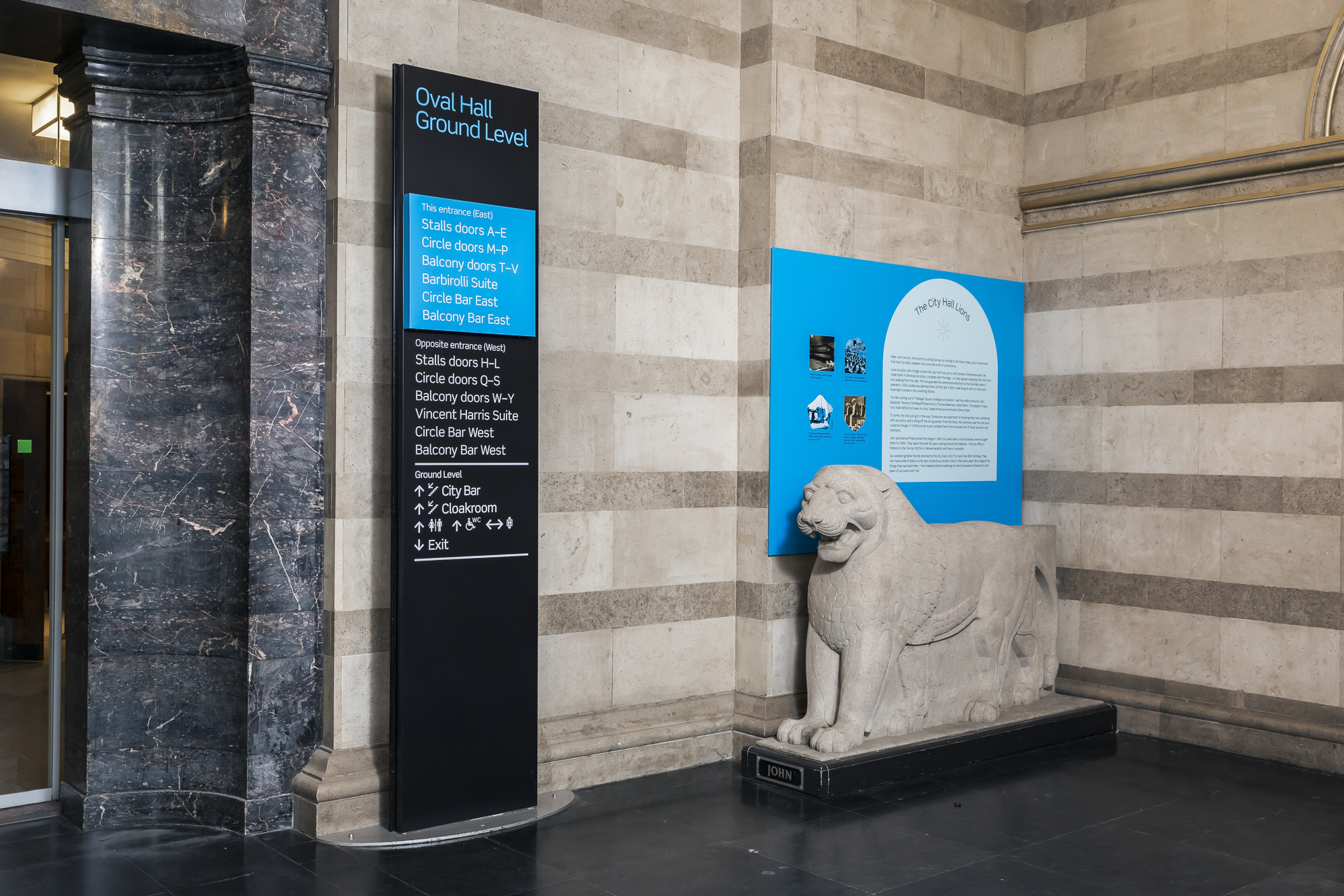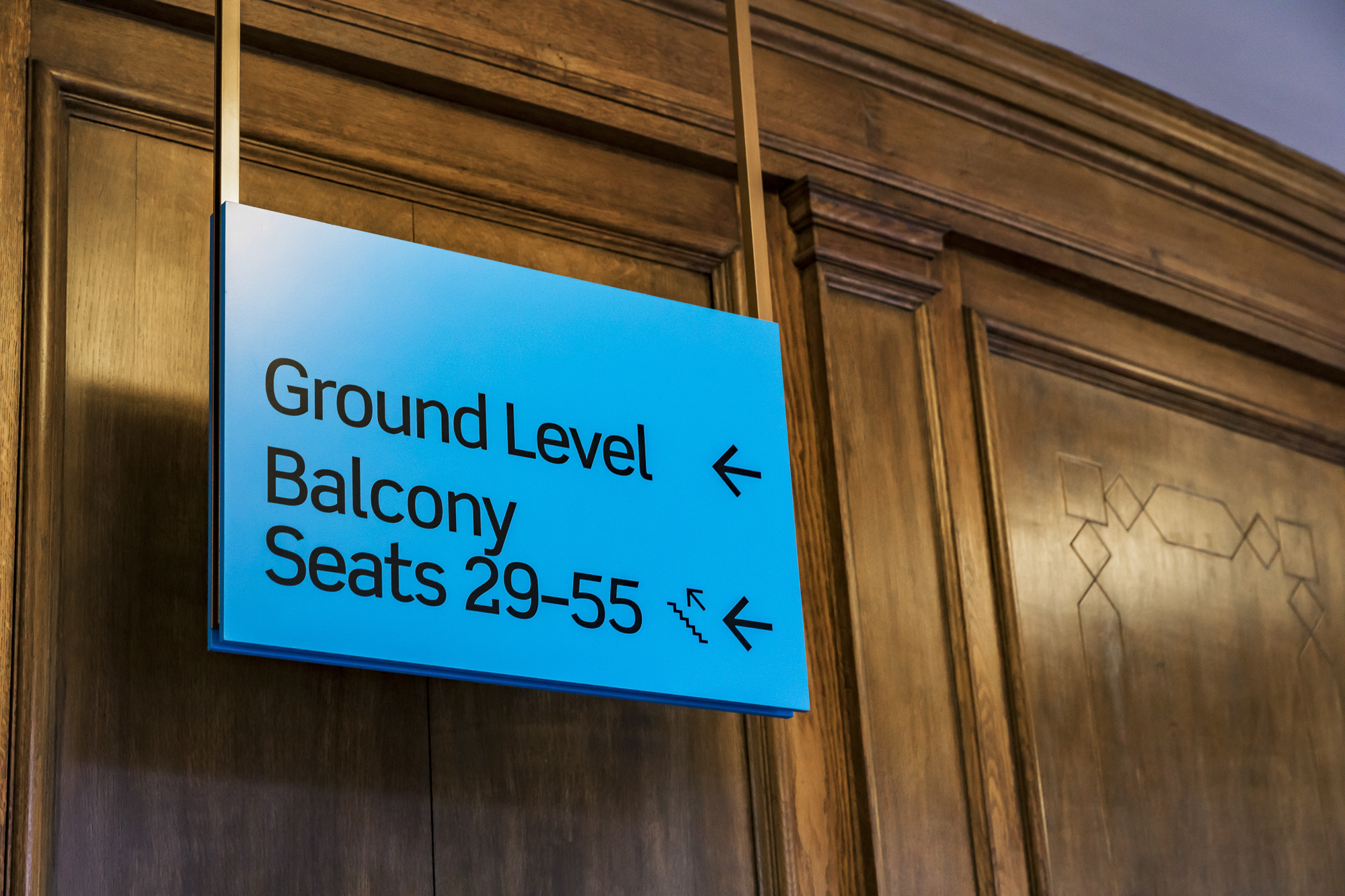 The City Hall is huge. With multiple floors and stages, a ballroom and several bars, it can be complicated to navigate. We worked on a signage audit with the front of house team to understand how visitors move around the building. This helped us to design a signage system that concisely conveys to people where they are and guides them to where they want to go.