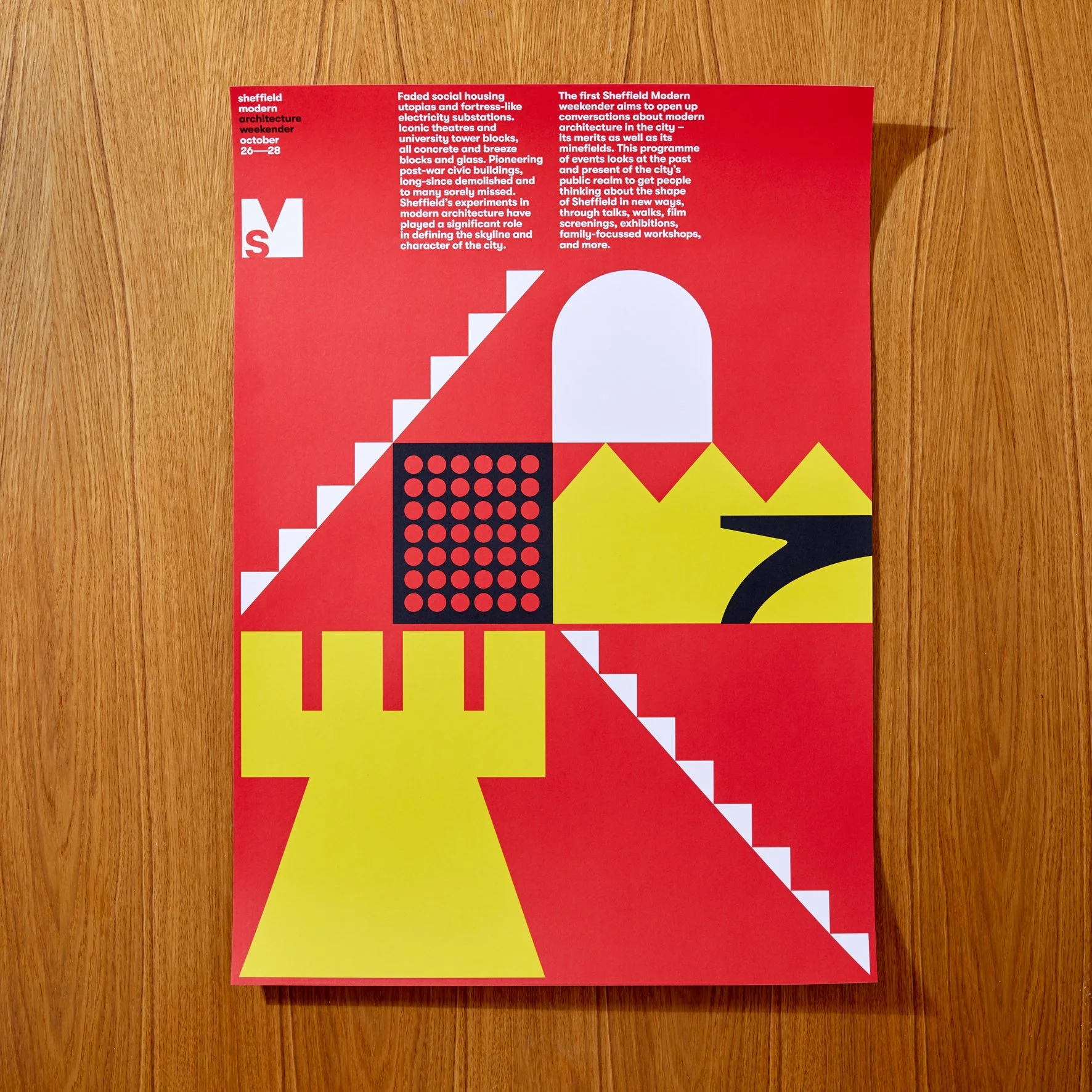 The brand identity we created for Sheffield Modern consists of a series of graphic shapes that reference our favourite buildings in the city. These shapes, plus a bold colour palette and simple typography, work together to create a cohesive visual language.